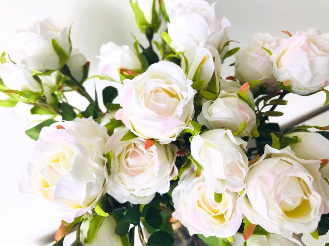 37 cm - Ramura mini trandafiri artificiali cu 5 flori in diferite dimensiuni. Crem delicat, ideal pentru orice aranjament floral. Inaltime produs: 37 cm